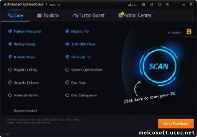 Advanced SystemCare - набор утилит для оптимизации системы. Проводит анализ системы, после чего производит оптимизацию системной конфигурации, в том числе изменяет на оптимальные настройки безопасности, удаляет из системы Spyware и Adware, исправляет ошибки в системном реестре, удаляет временные файлы, оптимизирует параметры интернет-соединения, позволяет управлять автозагружаемыми приложениями, производит дефрагментацию файловой системы и т.д. и т.п. Благодаря возможностям данной программы вы сможете очистить ваш компьютер от шпионского и рекламного ПО, обнаружить и заранее устранить возможные угрозы и бреши в системе безопасности ОС.