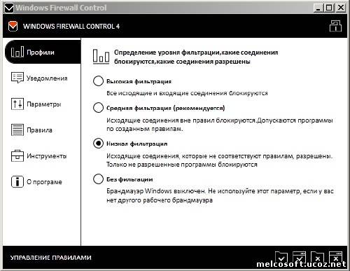 [center][]  [/][/center] Windows Firewall Control — программа располагается в системном трее и дает возможность эффективно управлять различными параметрами при помощи контекстного меню, например можно быстро разрешить/запретить другим программам выходить в сеть, настраивать правила, просматривать текущие активные сетевые соединения, импортировать/экспортировать политики и т.д.