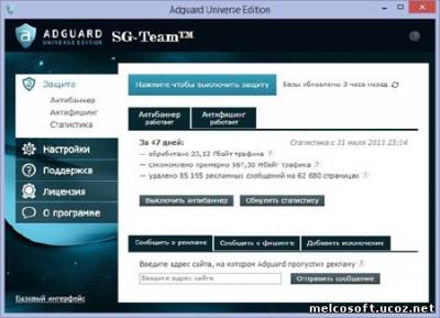 Adguard 5.7 — последняя версия популярного интернет-фильтра для борьбы c рекламой и вредоносными сайтами. Adguard работает со всеми популярными браузерами, задействуя минимум ресурсов. При использовании Adguard, рекламные изображения и ролики блокируются до того, как они оказываются загружены на компьютер. Такой подход позволяет сэкономить трафик и ускорить загрузку страниц при медленном соединении.