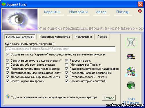 [center][]  [/][/center] Зоркий глаз - антивирусная утилита класса anti-autorun. Способный обнаружить подавляющее вредоносных программ, обитающих на флешках (даже новых и ранее неизвестных), Зоркий глаз станет отличным дополнением к вашему основному антивирусу. Не требует обновлений вирусных баз, не конфликтует с уже установленными антивирусными продуктами.