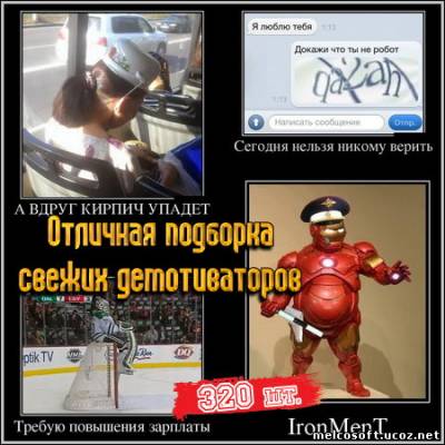 [center][]  [/][/center] Очередная порция приколов и юмора в отличной подборке свежих демотиваторов. Количество: 320 шт Формат: JPG Размер файла: 53.41 Mb