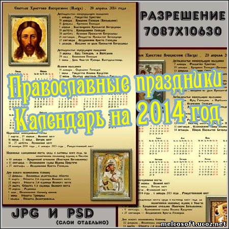 [center][]  [/][/center] Вам представлен календарь православных праздников и постов на 2014 год высокого разрешения в двух форматах JPG и PSD (слои отдельно).