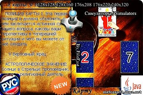 Если жизнь загнала тебя в тупик или тебе необходимо найти ответы на интересующие тебя вопросы, обратитесь к картам Таро! Год выпуска/Year of issue: 2012 Жанр/Genre: Симуляторы / Simulators Категория/Category: Java игры/Java games Размер экрана/Screen size: 128x128 128x160 176x208 176x220 240x320 Разработчик/Developer: J-Games Платформа/Platform: Java Формат файла/File format: .jar Вид устройства/Appearance of the device: для телефонов/for phones Язык интерфейса/Interface language: русский (RU) Размер/Size: 1,53 Mb Статус игры/The status of the game: бесплатная/free Подготовил/Prepared by: FileFast