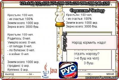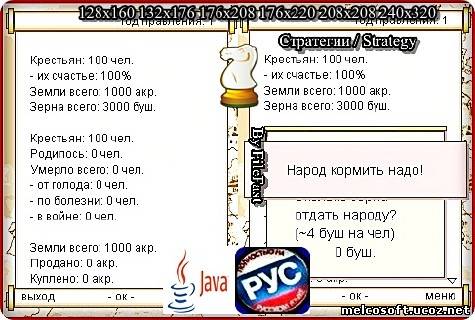 В этой java-игре, ты правишь кусочком земли, в Средневековой Европе. Твоя цель, защитить и накормить крестьян, засеять свои поля, отбивать нападения соседей на твои угодья. Жанр/Genre: Стратегии / Strategy Категория/Category: Java игры/Java games Размер экрана/Screen size: 128x160 132x176 176x208 176x220 208x208 240x320 Разработчик/Developer: Ga2me Платформа/Platform: Java Формат файла/File format: .jar Вид устройства/Appearance of the device: для телефонов/for phones Язык интерфейса/Interface language: русский (RU) Размер/Size: 1,50 Mb Статус игры/The status of the game: бесплатная/free Подготовил/Prepared by: FileFast